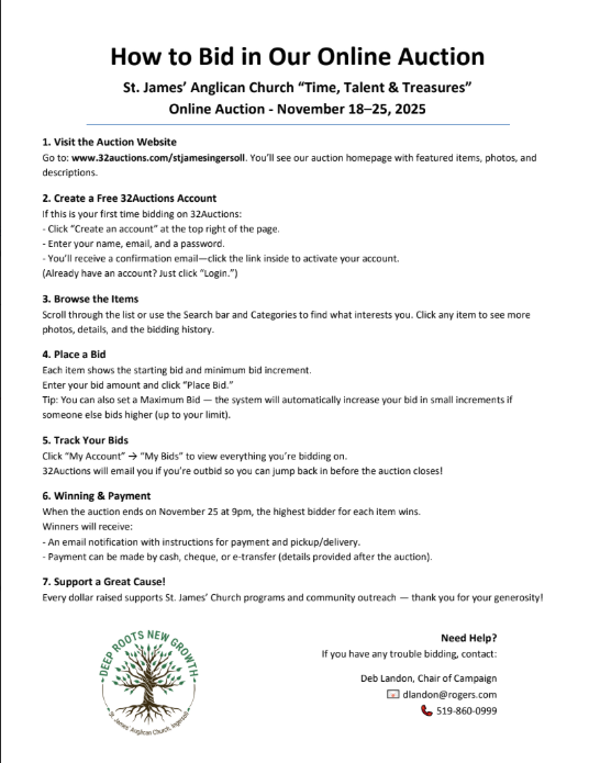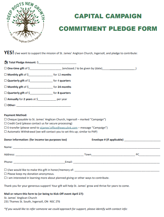We ask you to prayerfully consider how you can support this vision. Whether through a one-time gift or a pledge over time, every tax-deductible contribution, large or small, brings us closer to our goal. Together, we can ensure that St. James’ continues to be a place of worship, education, outreach, and advocacy, serving the people of Ingersoll with love and faithfulness.